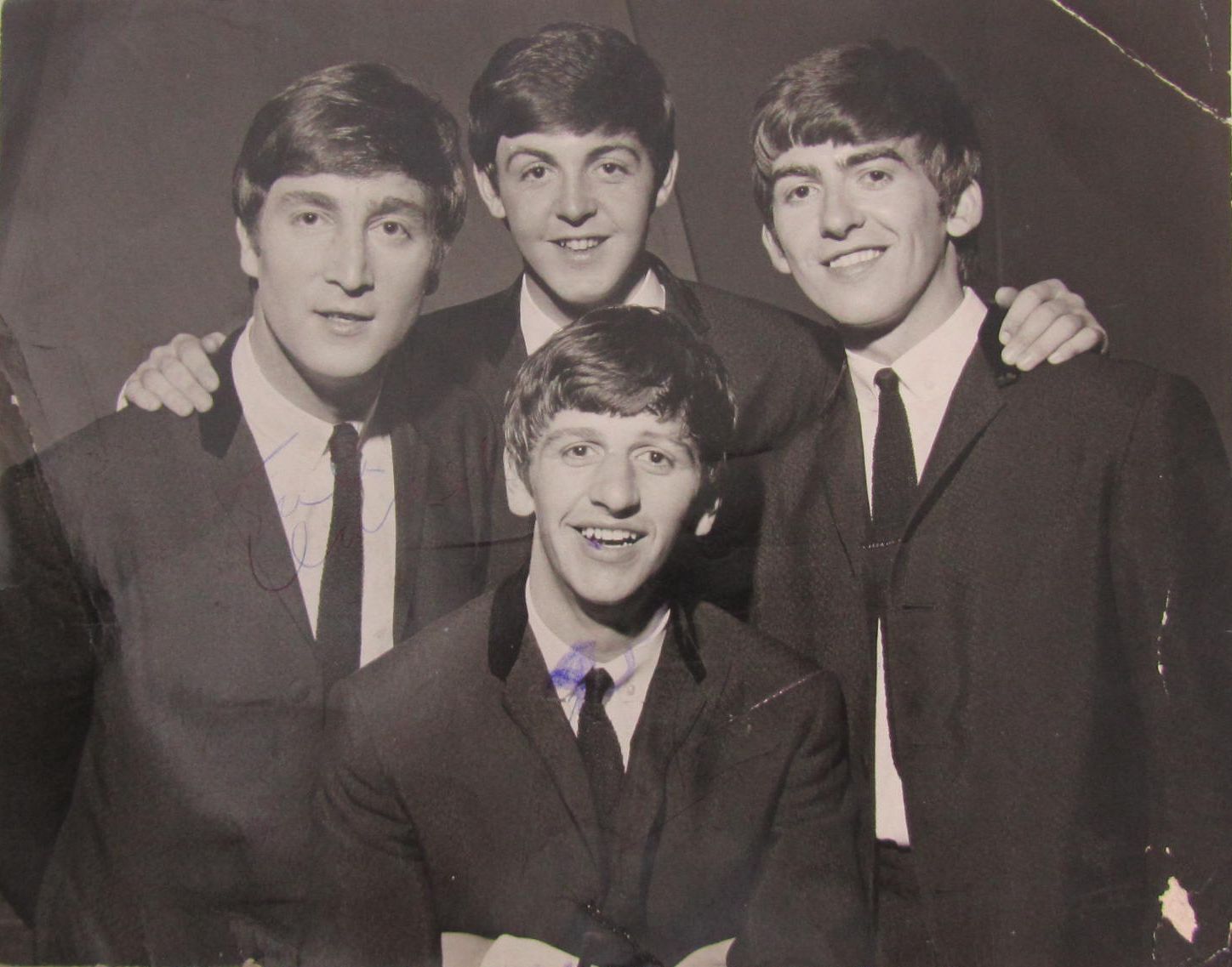 A signed group portrait of the Beatles, signed by John Lennon and Ringo Starr in blue ballpoint pen, approx. 19 by 25cm, edges of print creased with a small patch of wear in lower right corner, ink smudge just above Ringo's signature