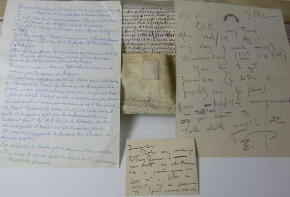 Pencil autograph letter, initialled, to unknown correspondent, agreeing to a visit "you hv. to get permission (by letter, or possibly can by phone) from hospital management", undated, one page, creased at folds; a small P.C. thanking Mr Cole for the Times Review, unsigned and undated; an unrelated one page biography, in French, of Monsier le Professeur Adolphe de Ceuleneer, c.1980; and an indenture on vellum between Richard Stydolke of Norbury and Sir William Drake of Shardeloners, 1 November 1657 (4)