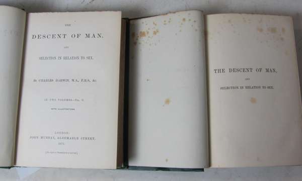 The descent of man. London: J. Murray, 1871. First edition, 2nd issue without errata on verso of volume 2 or Postscript leaf, 2 volumes, 8vo, 16pp.advertisements at end of both volumes, original cloth, some spotting, rubbed, one hinge broken; Idem The origin of species. London: J. Murray, 1878. Sixth edition, (twentieth thousand), original cloth, hinges weak, front endpaper and half-title loose, worn, a few small inkstains to cover (3)