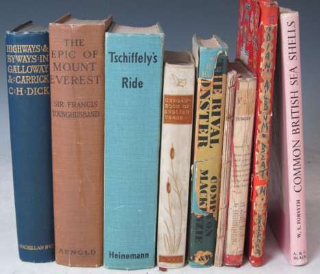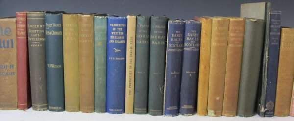 The penny wedding. London, 1836; Watson, W.J. Place names of Ross & Cromarty. 1904; Evans, A.H. A fauna of the Tweed area. 1911. Buckley, T.E. & J.A. Harvie-Brown. A vertebrate fauna of the Orkney Islands. 1891; Idem A fauna of the Moray basin. 1895. 2 volumes; Idem A vertebrate fauna of the Outer Hebrides. 1888; Idem A vertebrate fauna of Sutherland, Caithness and West Cromarty. 1887; Harvie-Brown, J.A. & H.A. Macpherson. A fauna of the North-West Highlands & Skye. 1904; Donaldson, M.E.M. Wanderings in the Western highlands and islands. 1923; Dixon, J.H. Gairloch in North-West Ross-shire. 1886; Peach, B.N. Chapters on the geology of Scotland. 1930; Stuart, J. Records of the priory of the Isle of May. 1868; Leslie, F. The early races of Scotland and their monuments. 1866. 2 volumes, 8vo, rubbed, joint broken; Dickson, John Emeralds chased in gold. 1899, all original cloth, a few spines faded and/or rubbed; Stevenson, R.L. The works. 1921. Pentland edition, limited to 1550 copies; 21 volumes including the Bibliography by Col. W.F. Prideaux, original cloth, uncut, rubbed; and 13 others, miscellaneous (qty)