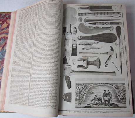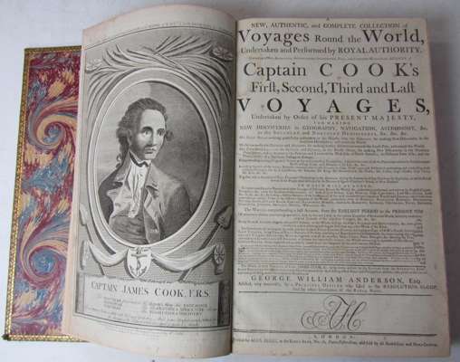 A new, authentic and complete collection of voyages round the world... London: for Alex Hogg, [no date]. Folio, portrait frontispiece, folding map, with c. 60 engraved plates only, 19th century calf, worn, lacking backstrip, boards loose, title and p. 341 torn (with loss of text). Sold not subject to return.