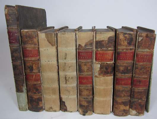 Travels to discover the source of the Nile... Edinburgh: for Archibald Constable and Co, 1804. Second edition, 8vo & 4to, 8 volumes, portrait, 3 frontispieces, half titles, atlas volume containing 79 plates and 3 folding maps, contemporary half calf, red labels, very worn, several volumes lacking backstrips, boards loose, plate 4 loose from atlas volume, waterstaining and foxing (8)
