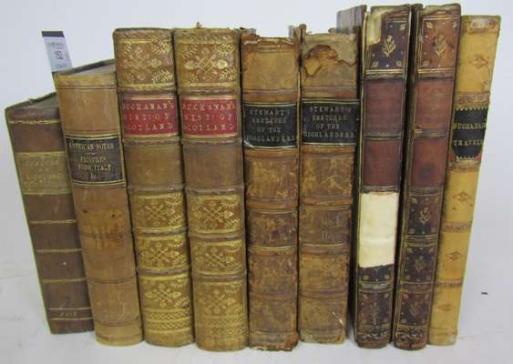 Travels in the Western Hebrides... London, 1793. 8vo, later half calf gilt, heavily rubbed, label chipped, foxing (mainly to title), waterstaining to inner hinges; Saint-Ford, B. Faujas Travels in England, Scotland and the Hebrides. London, 1799. 8vo, 2 volumes, 6 plates, later half calf gilt, hinges split, boards loose, some staining to plates; Buchanan, George The history of Scotland. Edinburgh, 1792. Fifth edition, 8vo, 2 volumes, contemporary calf gilt, rubbed, lacking two labels, 20th century ink inscripiton to endpaper; Stewart, Col. David Sketches of the character, manners... of the Highlanders of Scotland. Edinburgh, 1822. Secind edition, 8vo, 2 volumes, later half calf gilt, worn, boards loose, foxing and 2 others (9)