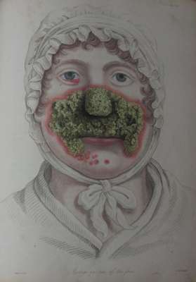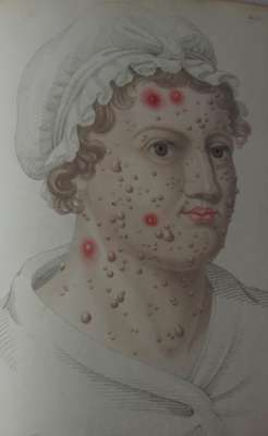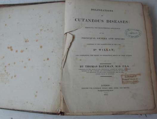 Delineations of cutaneous diseases. London: Longman &c., 1817. First edition, 4to, 72 hand-coloured engraved plates, half calf, preliminary leaves loose, torn and frayed, several library stamps, some spotting and dust-soiling, worn, lacks lower board, upper board detached