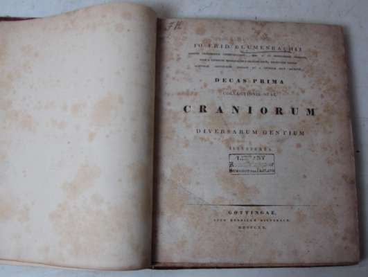 Decas prima [ - sexta] collectionis suae craniorum. Göttingen: H. Dietrich, 1820; bound with Nova pentas collectionis suae craniorum. Göttingen: H. Dietrich, 1828; lacking part 8, 4to, 65 [of 70] plates, later half calf, heavily spotted, library stamps to title, worn, lacks spine, covers detached