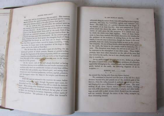 Travels among the Arab tribes inhabiting the countries East of Syria and Palestine. London: Longman &c., 1825. First edition, 4to, [xvi, 669], folding map, wood-engraved vignettes, contemporary half calf, several library stamps, library stamp at head of Preface deleted, some spotting and dampstaining, slightly rubbed, marbled paper of upper board lacking