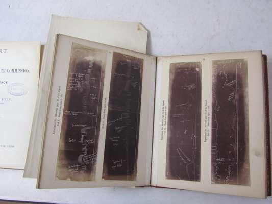 Report of the Hyderabad Chloroform Commission. Bombay: The Times of India Steam Press, 1891. First edition, 4to, contemporary light brown morocco, g.e.; [with] Selected Tracings of Experiments with Chloroform and Ether of the Hyderabad Chloroform Commission .To accompany the Report. 4to, 26 albumen prints mounted on board with printed captions, most c. 6.5 x 22cm. , red morocco gilt, g.e., lightly rubbed; with a 4 pp. folio printed letter from Surgeon Lt. Col. E. Lawrie, President of the Hyderabad Chloroform Commission to His Excellency Sir Asman Jah Bahadur, Prime Minister of Hyderabad, relating to the commission, library stamps (3)