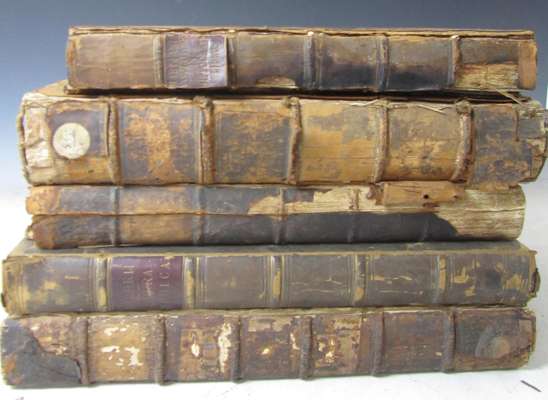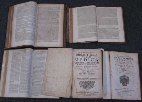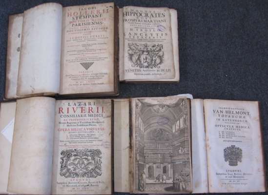 Bibliotheca realis medica. Frankfurt: J. Frideric, 1679. Folio, [20], 492, [42], engraved frontispiece, contemporary half calf, library stamp to engraved & printed title, spotted and stained, textblock split, worn, covers detached; Helmont, Jan Baptista Ortus medicinae. Lyons, 1655. Folio, 2 parts in one volume, contemprary calf, lacks title, spotting, very worn; Riviere, Lazare Opera medica universa. Lyons: A. Cellier, 1672. Folio, 3 parts in one volume, later half calf, soiling and spotting, lacks portrait; Houllier, Jacques Omnia opera practica. Paris: J. d'Houry, 1674. Folio, title printed in red and black, contemporary calf, library stamps, spotting and staining, foot of title repaired, worn, cover detached; Hippocrates Magnus Hippocrates cous Prosperi Martiani medici Romani notationibus explicatus. Venice: apud Guerilios. 1652. Folio, title vignette, contemporary calf, library stamp, dampstained chiefly in margin at end, worn, covers detached; Motherby, G. The medical dictionary. London, 1785. Folio, 26 engraved plates, one with slight loss, contemporary calf, spotting, a few leaves slightly frayed, worn, lacking one cover; sold not subject to return (6)