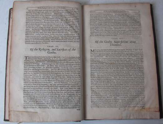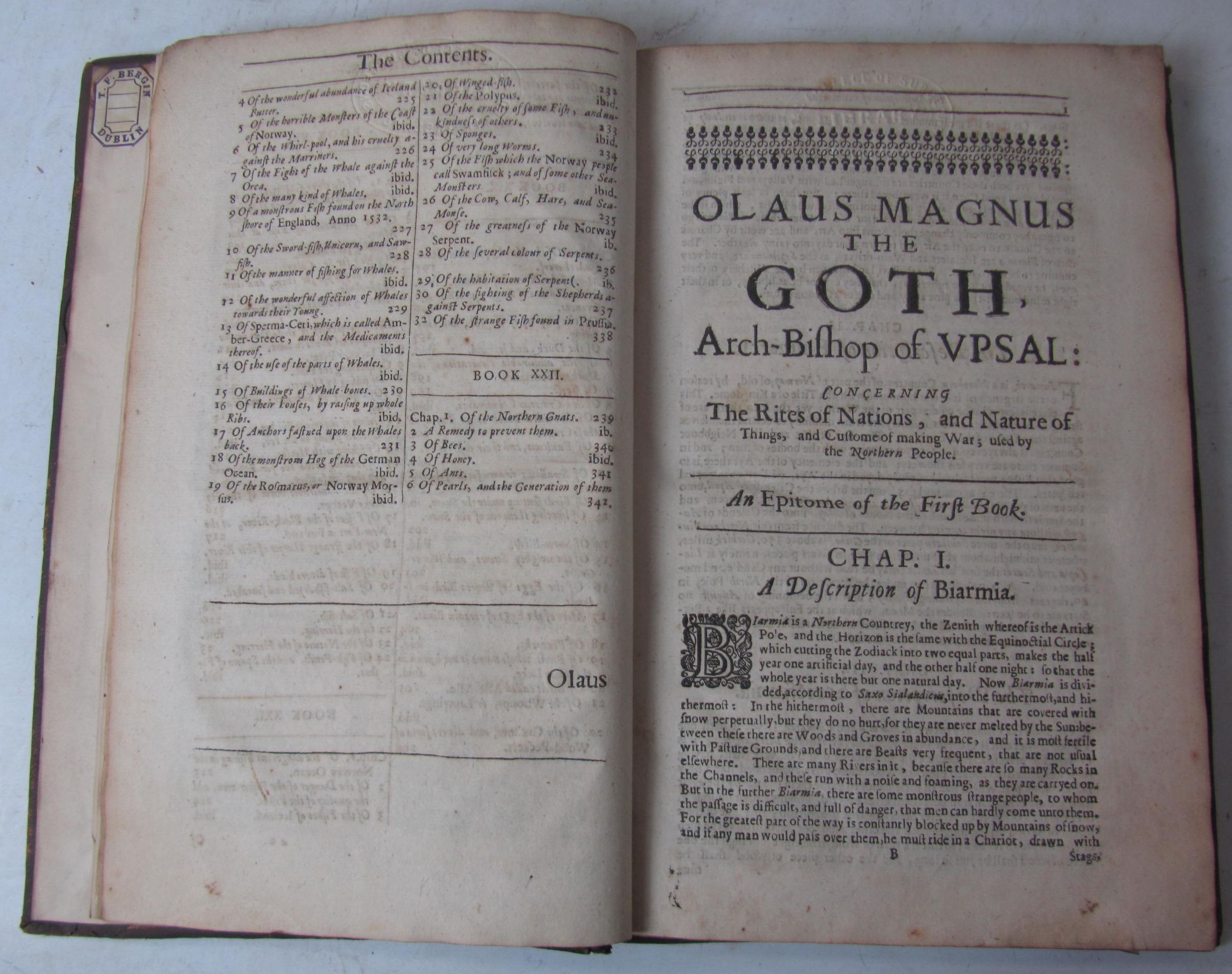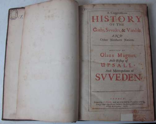 A compendious history of the Goths, Swedes & Vandals, and other Northern nations. London: J. Streeter, sold by H. Mosley, G. Sawbridge &c., 1658. 4to, [12], 342, title printed in red and black, contemporary calf, 19 leaves repaired in lower margin, some other lower margins dampstained and a few with slight marginal loss, several library blindstamps, rebacked, upper joint partly split