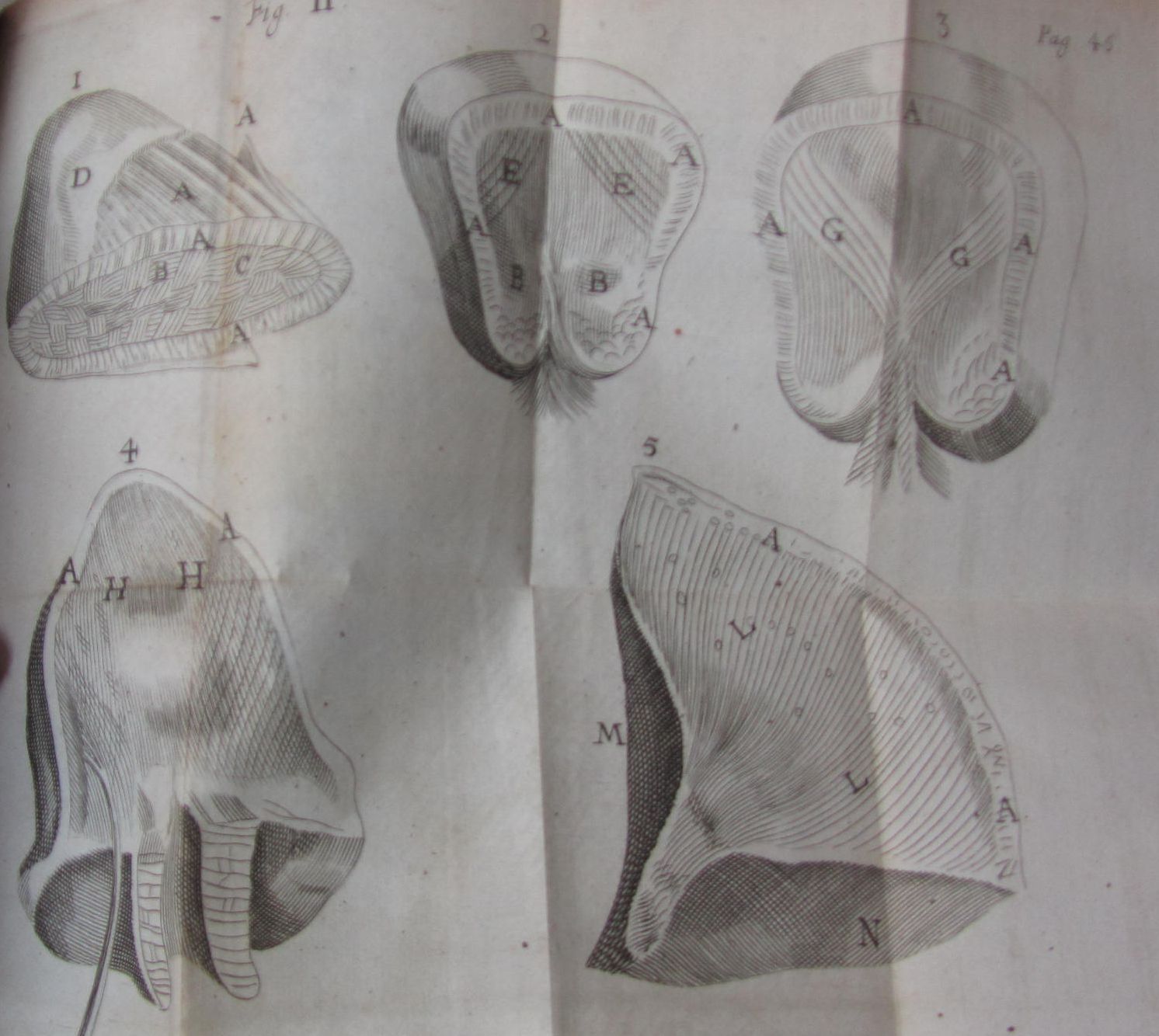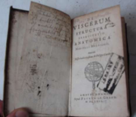 De viscerum structura exercitatio anatomica. Amsterdam: Pieter le Grand, 1669, 12mo; [bound with] Malpighi, Marcello & Caroli Fracassati. Epistolae anatomicae. Amsterdam: Caspar Commelin, 1669. First edition, 12mo, 5 folding engraved plates, slightly dampstained, 2 works in one volume, contemporary vellum, early inscriptions of Ludolph Smith 1671 on front endpaper, upper cover slightly stained, library stamp on title of first work