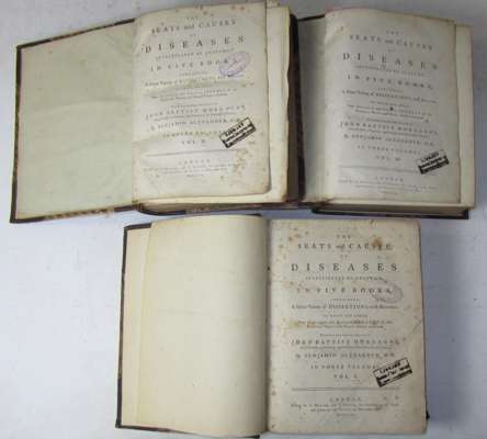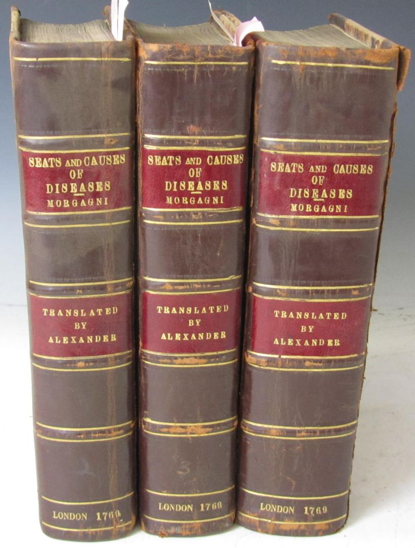 The seats and causes of diseases investigated by anatomy. London: A. Millar, T. Cadell &c., 1769. First English edition, 3 volumes, 4to, translated by Benjamin Alexander, twentieth century half calf, red morocco lettering pieces, some spotting, chiefly to preliminary leaves, library stamps, joints of volume 3 split, with initial blank leaf in volume 3, volume 1-2 lacking initial blank leaf, two preliminary leaves of volume 2 nearly detached