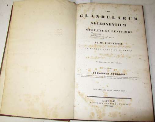 De glandularum secernentium structura penitiori. Leipzig: L. Vossius, 1830. Folio, 17 engraved plates, a few partly hand-coloured, contemporary half calf, spotted, library stamp to title, worn