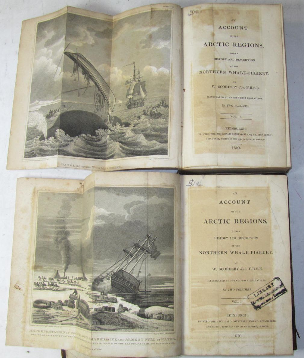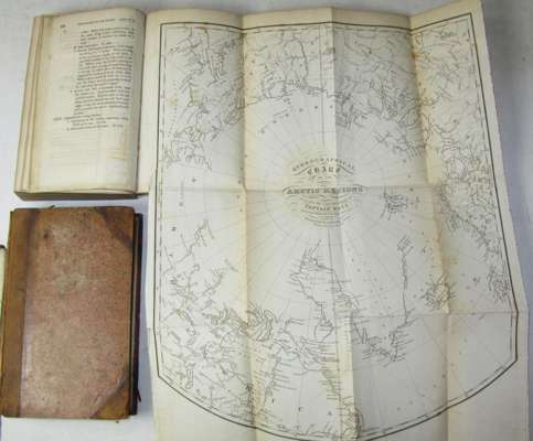 An account of the Arctic regions, with a history and description of the Northern Whale-Fishery. Edinburgh: A. Constable, 1820. First edition, 2 volumes, 8vo, 2 folding frontispieces and 22 engraved plates and maps, 4 folding tables, library stamp on volume 1 title, contemporary half calf, spotting & browning to plates and titles, lacks spines, covers detached