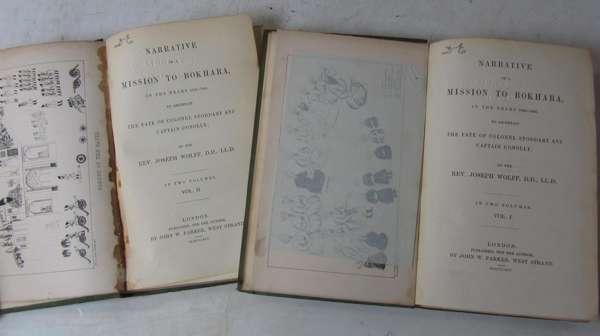 Narrative of a mission to Bokhara, in the years 1843-1845. First edition, 2 volumes, 8vo, 9 lithographed plates, original green cloth, plates slightly browned and spotted, library blindstamps, spines discoloured and rubbed at head and base of spine