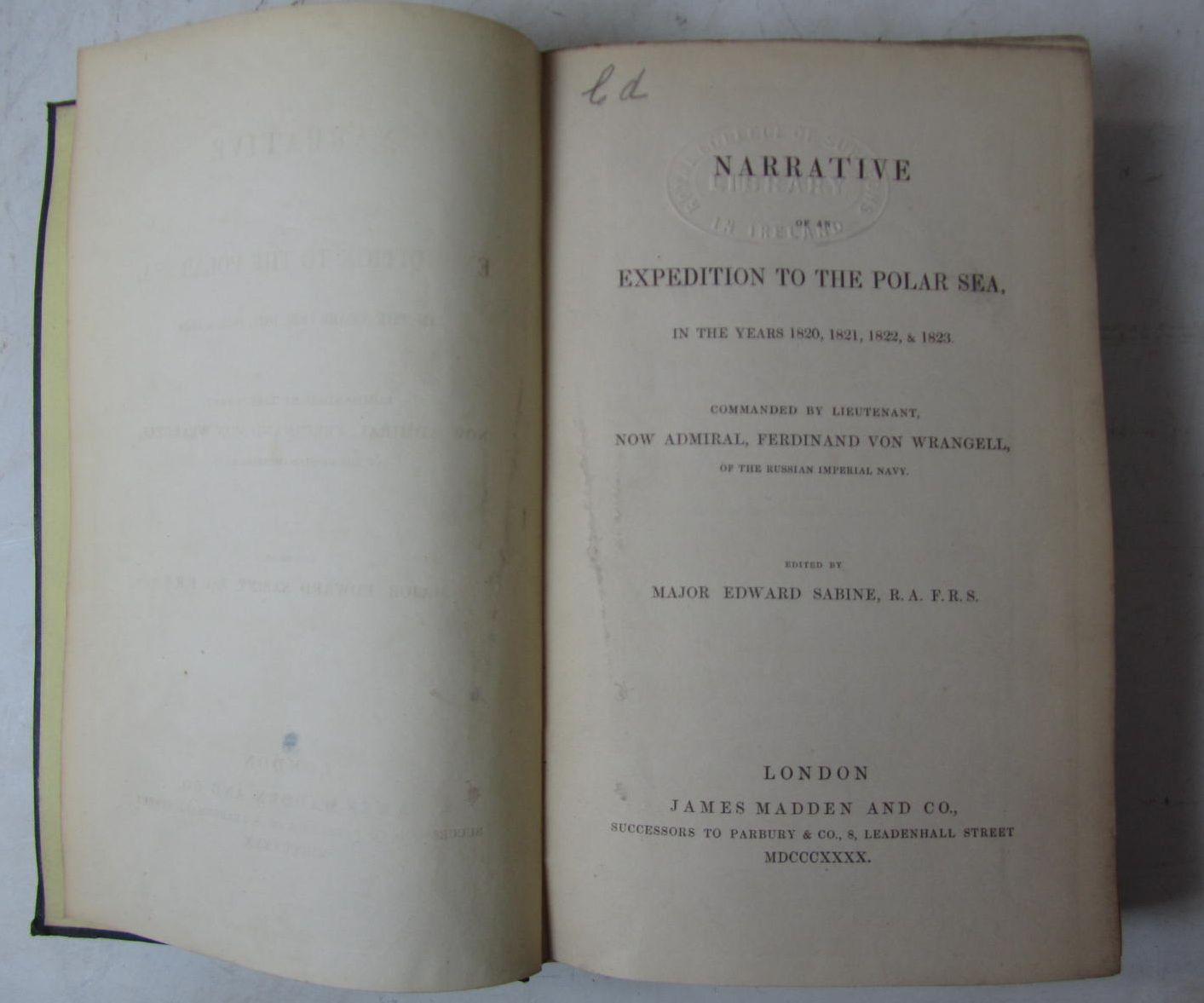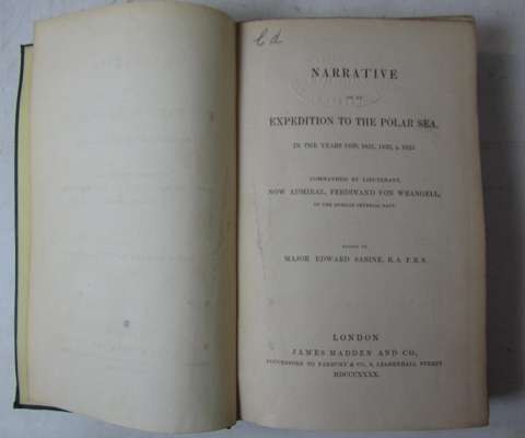 Narrative on an expedition to the Polar Sea. London: J. Madden, 1840. First edition, 8vo, edited by Edward Sabine, folding map in pocket at beginning, original cloth, rubbed, several library blindstamps