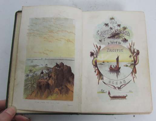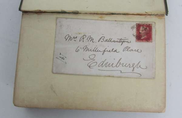 The Coral Island, a tale of the Pacific Ocean. London: T. Nelson & Sons, 1858. First edition, first issue, colour title and frontispiece, 6 colour plates, tipped in envelope addressed by author to his mother, original green cloth gilt, rubbed, patches of wear to edges and corners, inner hinge split, some foxing
