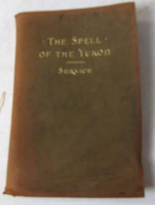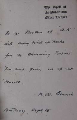 The spell of the Yukon and other verses. New York: Barse & Hopkins, 1907. First American edition, 12mo, presentation inscription "To the brother of A.K. [Archie Kerr Bruce] with every kind of thanks for the charming picture you have given us of our house, R.W. Service, Brittany, April. 10 [?], with 2 small sepia photographs of (?) Peter Ross Bruce and R.W. Service tipped onto front endpaper, soft calf, endpapers loose, binding faded
