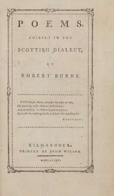 Note: The single most famous volume in Scotland's impressive literary heritage is without question the first edition of Robert Burns's Poems chiefly in the Scottish dialect. It almost never saw the light of day. Burns's farming activities at Mossgiel farm were not profitable and although he wished to marry Jean Armour, who was pregnant by him, the marriage was opposed by her father, so Burns made plans to emigrate. It was only the suggestion by a local lawyer, Gavin Hamilton, that he could finance his voyage to Jamaica by publishing some of his poems, that led to him approaching a nearby printer, John Wilson, in Kilmarnock.
