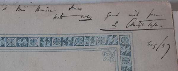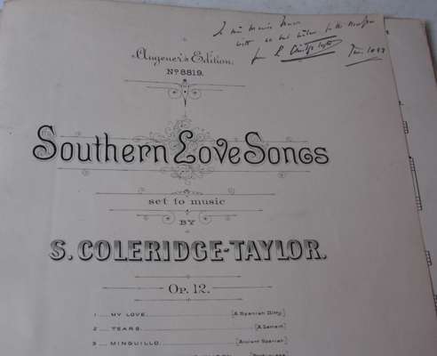 Note: The "Miss Mamie Ellis" of the inscriptions was Mary Maeve Ellis, neé Fraser, the grandmother of the vendor, who was a fellow student with Samuel Coleridge-Taylor at the Royal College of Music in London in 1897. After leaving the R.C.M. Mary Maeve Fraser left for India where she married, returning as Mrs Mary Maeve Ellis, hence the initials on the cover of the works.