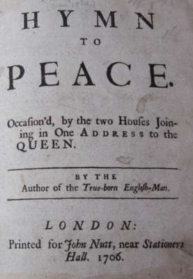A hymn to peace. Occasion'd by the two houses joining in one address to the Queen. By the author of the True Born English-Man. London: John Nutt, 1706. First edition, 4to., 60pp., modern green half morocco, Earl of Perth's crest on upper board, [ECCO CW3321967021], a few page numerals just shaved, title and a few leaves slightly soiled