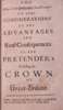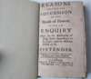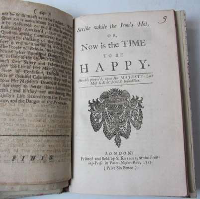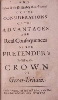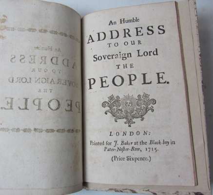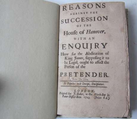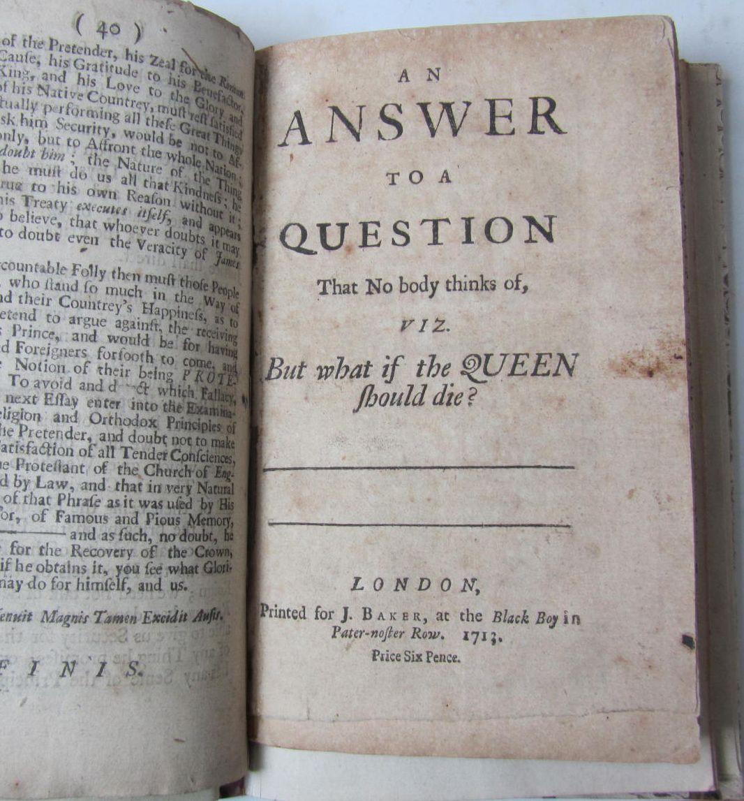 Reasons against the succession of the House of Hanover, with an enquiry how far the abdication of King James, supposing it to be legal, ought to affect the person of the Pretender. London: J. Baker, 1713. First edition, 8vo., some marginal staining; [Defoe, Daniel] And what if the pretender should come ? London: J. Baker, 1713. 8vo., a few leaves slightly dampstained; [Defoe, Daniel] An answer to a question that no body thinks of, viz. but what if the Queen should die ? London: J. Baker, 1713. 8vo., some spotting; [Defoe, Daniel] Strike while the iron's hot, or notwis the time to be happy. London: S. Keimer, 1715. 8vo.; [Defoe, Daniel] An humble address to our soveraign Lord the people. London: J. Baker, 1715. 8vo., half-title, 5 works in one volume, modern marbled boards, Lord Perth's crest on morocco label on upper cover