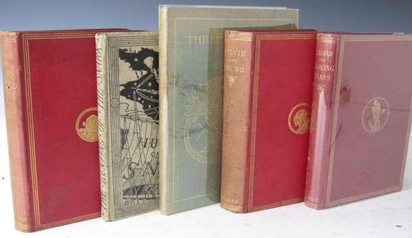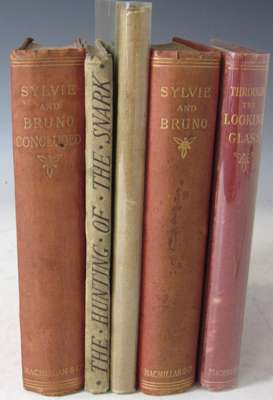 Through the Looking Glass. London: Macmillan and Co., 1872 [i.e. December 1871], First edition, 8vo., first issue with misprint "wade" for "wabe" in the second line of "Jabberwocky" on p.21, wood-engraved illustrations, original red cloth with central gilt vignettes of the Red and White Queens on covers, dark green coated endpapers, g.e., extremities slightly rubbed, light spotting to spine, previous owner's signature on front free endpaper, [Lovett and Lovett 13; Williams, Madan and Green 84]; Sylvie and Bruno, 1889; Sylvie and Bruno Concluded, 1893, 8vo, first editions, illustrated by Harry Furniss, original red cloth gilt, g.e, spines slightly rubbed and faded, small perforation mark to spine of the latter, small light stain to spine of the former; [Dodgson, C.L.] The Hunting of the Snark. London: Macmillan, 1876. First edition, 8vo, illustrations by Henry Holiday, half-title, original pictorial cloth, g.e., lightly soiled and rubbed; [Dodgson, C.L.] Three sunsets and other poems. London: Macmillan, 1898. First edition, 8vo, 12 plates after Gertrude Thompson, original pictorial cloth, spotted, binding discoloured (5)