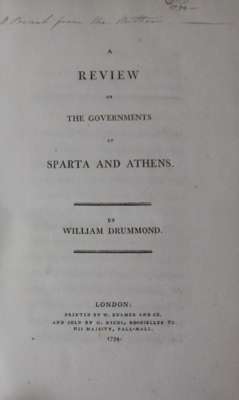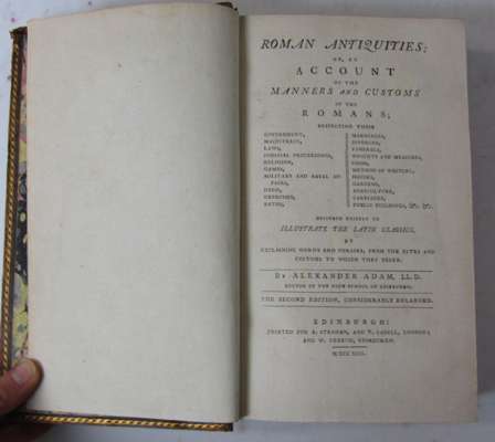 A review of the governments of Sparta and Athens. London: Bulmer and Co., 1794. First edition, 8vo., inscribed on title page: "A present from the author," contemporary calf gilt, some spotting, spine chipped; Adam, Alexander Roman antiquities or an account of the manners and customs of the Romans... Edinburgh: W. Creech, 1792. First edition, 8vo., contemporary calf gilt, rubbing to spine and covers and two small wormholes in spine, endpapers foxed; Savary, M. Letters on Greece. London, 1788. 8vo, folding map and 1 plate, contemporary calf, rubbed; [Voltaire, F.M.A.] Lettres chinoises, indiennes et tartares. Geneva, 1776. 8vo, calf, spotted, rubbed; and 4 others (8)