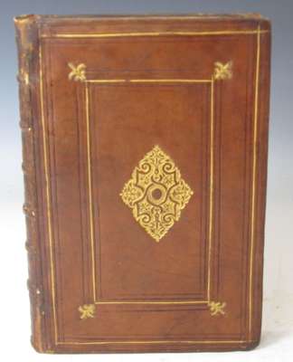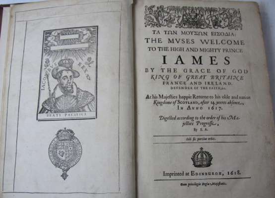 The muses welcome to the high and mighty Prince James... at his Majesties happie returne to his olde and native Kingdome of Scotland, after 14 years absence, in anno 1618. Edinburgh, [Andreas Hart], 1618. Folio, 2 parts in one volume, woodcut portrait frontispiece, contemporary panelled calf gilt with central gilt diamond design, lower joint repaired, [STC 141, 142]