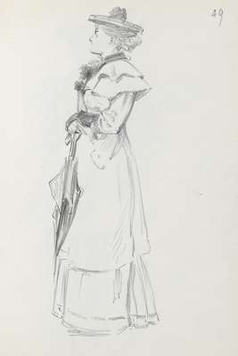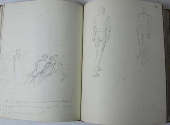 Note: The note by Gerard du Maurier erroneously states that the sketches were made in 1874-5 whereas in fact they were made in 1894-5. A further note, initalled D.P.W., 1956, notes that the dates in pencil on the verso page refers to the sketch on the recto page and indicates the date on which the completed drawing was reproduced in Punch. There is also a 5pp. ms of a revised passage of Trilby and a 2pp. ms. of a draft of a passage from The Martian.