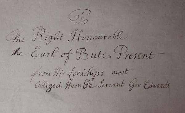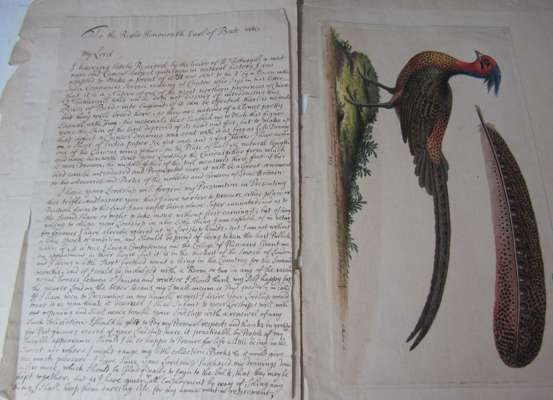 Long autograph letter signed to Lord Bute, discussing a drawing of an Argus or pheasant, hoping that it can be introduced to Great Britain where "it will be a great ornament of the aviaries and parks of the nobility and gentry of Great Britain", modestly supplicating "a room or two in any of the vacant royal houses between St. James and Windsor", as his apartment in the College of Physicians "is in the thickest of the smoak of London and I being a little short-brethed", stating that he has a few more drawings which he would keep for amusement during his life "except your lordship would condescend to accept them as a present", and promising to exchange his copy of Catesby's History of Carolina, coloured by George Edwards after Catesby's own, for Lord Bute's copy. He also refers to taking reversed prints of his history of birds and has "coloured them higher than ordinary to make them appear something like drawings, they have decieve[d] some people", and offering his coloured set of Gleanings to Lord Bute, or "if your Lordship thinks them worth the Queens acceptance for her library I should be proud of the honour to present them", and enclosing a coloured engraving of the Argus or pheasant, in a folded sheet of paper inscribed "To the Right Honourable the Earl of Bute Present, from his Lordships most obliged and humble servant, Geo. Edwards", the folded paper split at fold and frayed, letter and print very clean