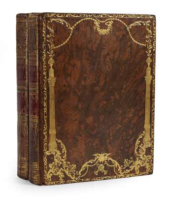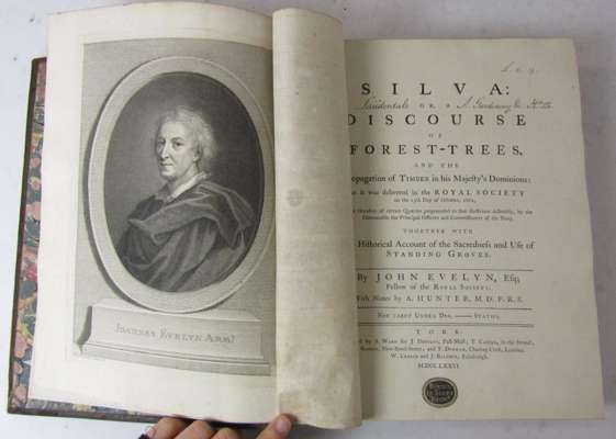 Silva: or a discourse of forest-trees… York: Printed for A. Ward for J.Dodsley &c., 1776. 4to., 2 volumes, portrait, 40 plates (one folding) and folding table, bound by Scott of Edinburgh with his stamp on title page in contemporary tree calf with rococco gilt tooling showing columns, floral swags and acanthus leaves, bookplates of John Roland Abbey, slight foxing A2-B2 and to several plates, slight rubbing to spines (2)
