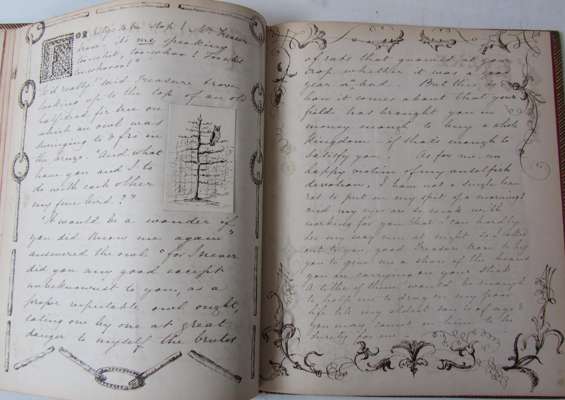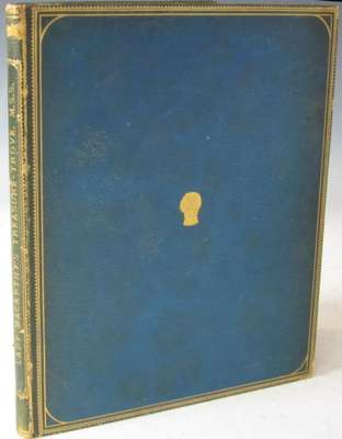 Manuscript of "The astonishing history of Treasure-Trove and Peas Blossom, translated from the French and illustrated with original designs by a totally unknown artist. 1865", an English translation of Nodier's fairy tale Trésor des fèves et fleur des pois (1833), written in brown ink, dated at the head "24 March 1865", the margins decorated with pen and ink drawings of flowers and plants, animals, people, towns etc., with 15 small drawings illustrating the story (65 x 55mm and smaller) on card, set into the text, 62 pages, 205 x 165mm., blank leaves, 19th century blue morocco, gilt title ("Lady Macarthy's Treasure Trove M.S.S."), bookplate of Robert, Marquess of Crewe