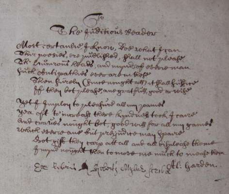 Alexander Garden or Gardyne (c. 1585 - c. 1642), Scottish poet from Aberdeenshire. He is believed to have graduated from Marischal College before 1609 when a work of his was published calling him Mr., implying he had the degree of MA. This book was A Garden of Grave and Godlie Flowers: a collection of poems, elegies and prayers in praise of King James, other public figures and also friends. His The Theatre of the Scottish Kings (c. 1625, but started in 1612) and A Theatre of Scottish Worthies are a series of short poems about every Scottish king from Fergus I on, and about various warriors and knights. He also wrote The Lyf, Doings and Deathe of William Elphinstoun (1619).