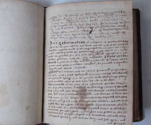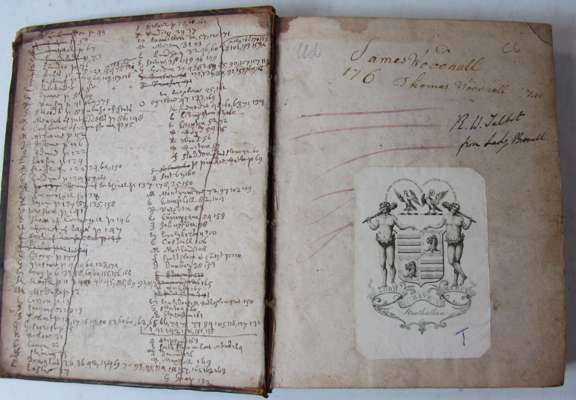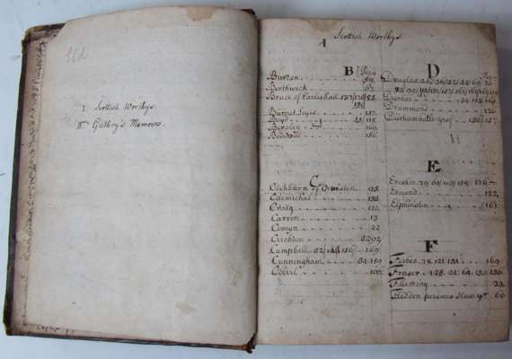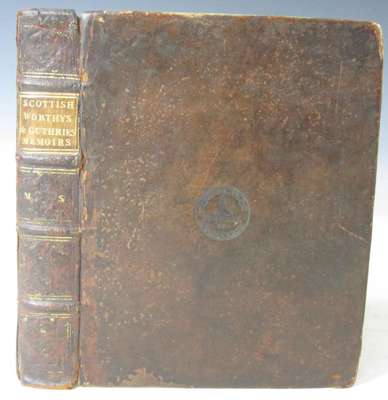 [A theatre of Scottish worthies], manuscript copy by Robert Mylne (1643?–1747), late 17th century, 8vo, 179pp., [bound with] a manuscript copy of "The history of the rebellion of the martyr King Charles the first begun by his most loyall subjects the Scots Covenanters and continued by the English.. by our Henrie Guthrie presbyterian minister", in a different hand, dated 1665, 282pp., 8vo, early eighteenth century calf with Boswell of Auchinleck blindstamp on covers, inscription of James Woodhall and Thomas Woodhall 1740 and "R.W. Talbot from Lady Boswell" on front endpaper, Lord Strathallan bookplate on front endpaper, joints split, a few spots and stains, spine and corners worn