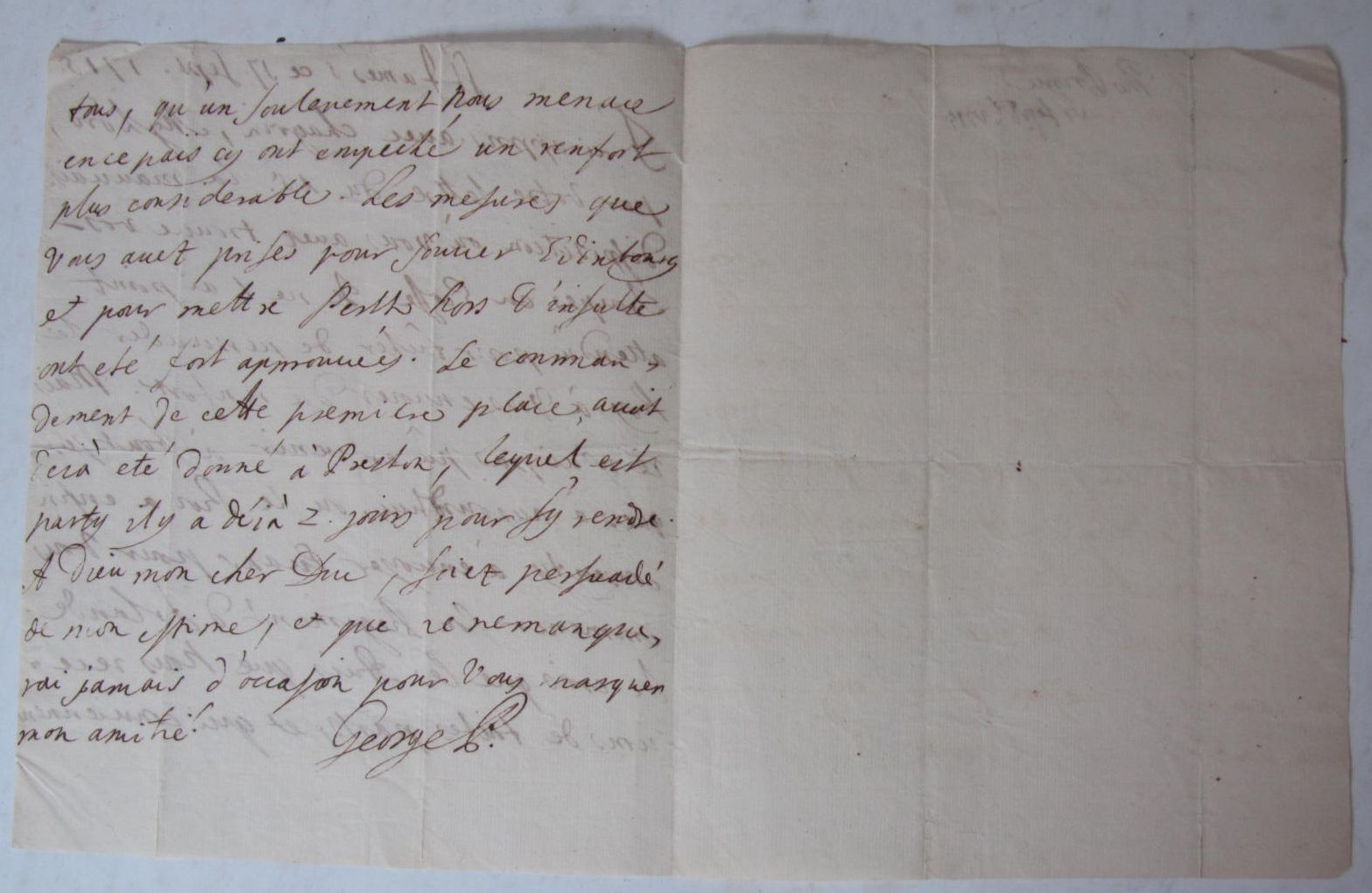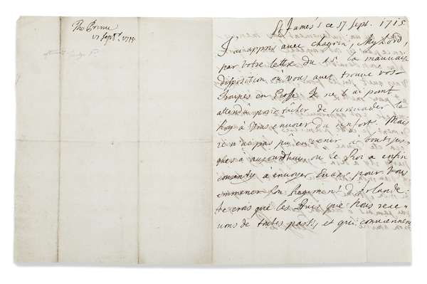 Autograph letter signed, as Prince of Wales {'George P'), in French, [to John Campbell, Duke of Argyll], promising to do his best to persuade the King to send reinforcements to Scotland, St. James, 17 Sept. 1715, 2 pages "J'ai appris avec chagrin, My Lord, par votre lettre du 15 la mauvaise disposition où vous avez trouvé vos troupes en Ecosse. Je ne l'ai point attendu pour tacher de persuader le Roy à vous envoier du refort... les mesures que vous avez prises pour souver [sic] Edinbourg et pour mettre Perth hors d'insulte ont eté fort approuvées..."
