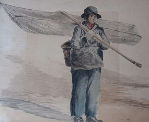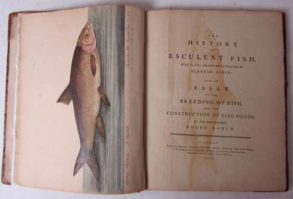 The history of esculent fish. London: printed for Edward Jeffery, 1794. First edition, 4to.,18 hand coloured engraved plates and 7 engraved end-pieces by Albin, extra-illustrated with two original drawings (one coloured) of fishermen, an engraving of fisherfolk by Wheatly, 8 early engravings of Dutch estates with waterways and lakes and 4 quarto sized hand coloured engraved plates from William Wood's Illustrations of British Fresh-Water Fish [1842-43], contemporary marbled boards, half calf corners and spine sensitively repaired, bookplate of Henry A. Sherwin, 1895, some offsetting onto text
