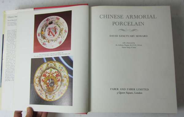 Chinese armorial porcelain. London: Faber and Faber, 1974. 4to., 25 colour plates, pink cloth gilt with sun and lotus flower emblems, dust jacket, some rubbing to corners of dust jacket, base of spine slightly faded