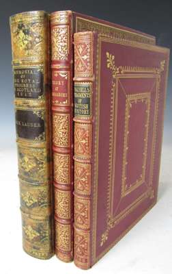 Notes historical and descriptive on the priory of Inchmahome... Edinburgh: William Blackwood, 1815. 4to., engraved frontispiece and 5 engraved plates by W. and D. Lizars, edges gilt, contemporary red morocco, gilt tooled with quatrefoil floral pattern and floral borders, some foxing to plates and slight soiling to covers, joints rubbed; [Dayell, John Graham, Sir] Fragments of Scotish [sic] history. Edinburgh: A. Constable, 1798. 4to., 3 engraved tables and facsimile frontispiece: 'Permission granted to a bondman to change his master', later red morocco, panelled gilt tooling, slight soiling to covers, some fading and rubbing to spine, some darkening and spotting to pages, occasional offsetting onto text; Lauder, Thomas Dick, Sir Memorial of the royal progress in Scotland. Edinburgh: A. & C. Black, 1843. 4to., engraved frontispiece, map, plan of royal yacht and 11 engraved plates, contemporary red and black mottled calf, spine gilt, floral gilt tooled doublures and marbled endpapers, some foxing to plates and fading to spine (3)