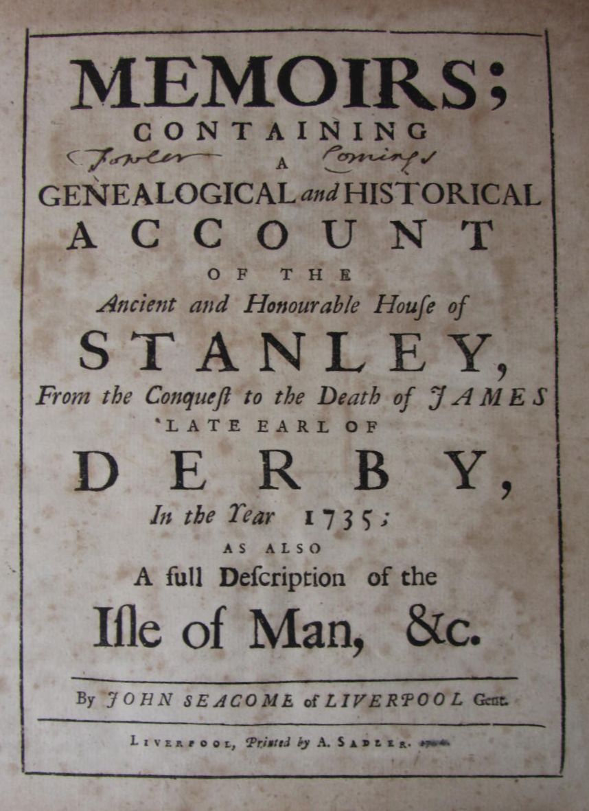 Memoirs, containing a genealogical and historical account of the ancient and honourable house of Stanley... as also a full description of the Isle of Man. Liverpool: A. Sadler, 1741. 4to, 2 parts in one volume, nineteenth century embossed calf, somewhat spotted