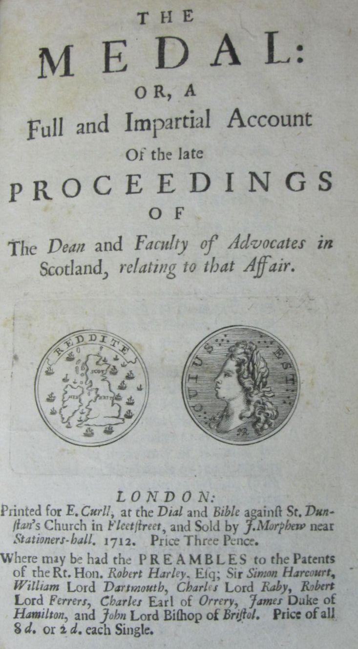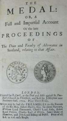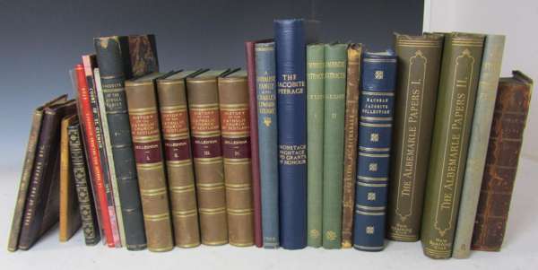 Gordon, Elizabeth Howard, Duchess The medal... London: E. Curll, [1712]. Small 4to., modern half calf, [ESTC T39090]; [Defoe, Daniel, attr.] The scotch medal decipher'd... London: S. Popping, 1711. Small 4to., [ESTC T47194], slight spotting and dust soiling; [Craufurd, Thomas] Notes and observations on Mr. George Buchanan's history of Scotland... Edinburgh: Robert Freebairn, 1708. 8vo., later blue half morocco, [ESTC T113830], slight dust soiling, boards a little rubbed; [Forbes, Robert] A plain, authentic and faithful narrative of... the young chevalier... London: W. Webb, 1765. 12mo., later quarter calf, later bookplate reads "Downing Library, the library of Thomas Pennant...", [ESTC T172509], some soiling to boards and pages; [Anon.] Tales of the tories... London: W. Robins, 1718. Small 4to., later half morocco, [ESTC T49847], some dust soiling and rubbing to spine and boards (bound with 3 other pamphlet publications); Erskine, James, of Aberdona Jacobite correspondence of the Atholl family... Edinburgh: Abbotsford Club, 1840. 4to., blue half morocco, some fading and rubbing to covers and spine, occasional spotting; Hamilton and Brandon, James, Duke of Le parade des archers ecossois... Edinburgh: [N.p.], 1734. 4to., modern red half morocco, [ESTC N23686], slight dust soiling; [Macky, John] A view of the court of St Germain...directed to the malcontents Protestant of England. London: R. Baldwin, 1696. 4to., modern marbled boards, [Wing M221B; ESTC R11112], slight marginal worming, small amount of dust soiling, title page neatly repaired; Grace, Sheffield A letter from the Countess of Nithsdale... London: [N.p.], 1827. 8vo., contains four pages of music, later quater calf, some soiling to boards and spine. Bellesheim, Alphons History of the Catholic church of Scotland... Edinburgh: William Blackwood and Sons, 1887. 8vo., 4 volumes, 4 coloured maps, later green half calf, some fading to spines; Skeet, Francis John Angus Catalogue of Jacobite medals and touch-pieces. Leeds: John Whitehead and Son Ltd., 1938. 4to., inscribed by the author, red cloth gilt; MacGregor, A.G. Murray (translator) A royalist family... Edinburgh: William Brown, 1904. 4to., inscribed to, "...Eric Drummond on the occasion of his marriage..." from the translator, blue cloth, slight soiling to covers and spine and foxing to endpapers; and 10 others (25)