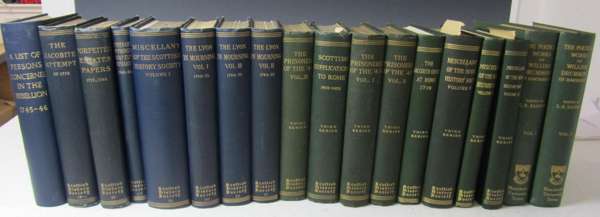 Paton, Henry The lyon in mourning...1746-1775. 1895. 8vo., 3 volumes, very occasional foxing; Roseberry, Earl of and MacLeod, Walter (Editors) A list of persons concerned in the rebellion... 1890. 8vo.; Dickson, William Kirk (Editor) The Jacobite attempt of 1719. 1895. 8vo., separate sheet with inscription from author to "Jim" attached to endpaper, slight rubbing and bumping to spine; Blaikie, Walter Biggar (Editor) Itinerary of Prince Charles Edward Stuart... 1897. 8vo., folding map contained in pocket on paste-down endpaper; and 2 others; Uniform Edinburgh: Edinburgh University Press for the Scottish History Society, blue cloth embossed in gilt with logo of the Scottish History Society; Napier, Mark Memorials and letters illustrative of the life and times of John Graham of Claverhouse... Edinburgh: T.G. Stevenson, 1862. 8vo., 3 volumes, engraved portrait, blue cloth gilt, very occasional foxing, slight soiling to covers and spines, volume 1 pp.387-88 torn and mostly lacking, two endpapers torn. Seton, Bruce Gordon, Sir and Arnot, Jean Gordon The prisoners of the '45... 1928-1829. 8vo. 3 volumes, some darkening to endpapers and slight soiling and bumping to covers and spines; Tayler, Henrietta (Editor) The Jacobite court at Rome in 1719... 1938. 8vo. Lindsay. E.R. and Cameron, A.I. (Editors) Calendar of Scottish supplications to Rome... 1934. 8vo., slight bumping to spine; and 6 others; Uniform Edinburgh: Edinburgh University Press for the Scottish History Society, green cloth embossed in gilt with logo of the Scottish History Society; Drummond, William, of Hawthornden The poetical works. Manchester: Manchester University Press, 1913. 8vo., 2 volumes, contemporary green cloth, spines gilt, some darkening to endpapers (23)