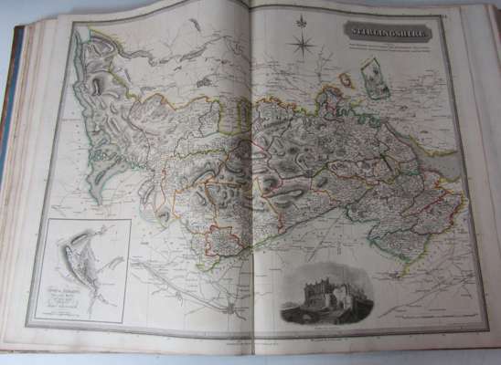 The atlas of Scotland, containing maps of each county. Edinburgh: John Thomson & Co., 1832. Large folio, contemporary half calf, 39 maps with coloured outlines and two folding coloured plates of the rivers and mountains of Scotland, rubbing to spine and boards, some dust soiling, slight offsetting and minor spotting