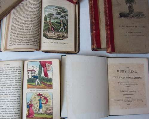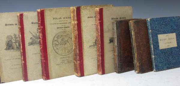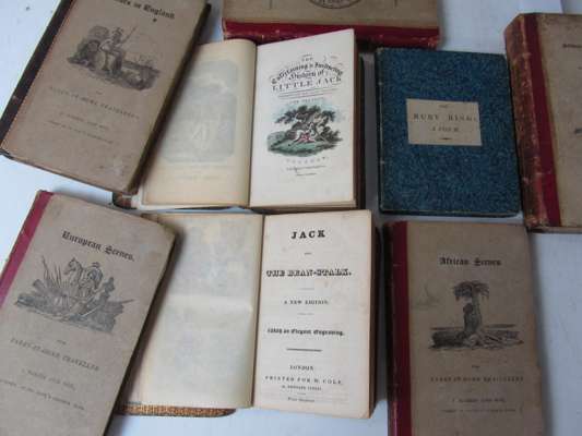 The ruby ring. London: N. Hailes, 1816. 12mo., 8 engraved plates, original marbled boards, paper label on cover, light spotting; [Cole, W., publisher] Jack and the bean-stalk. London, [n.d.], 12mo., 2 coloured plates, original wrappers [bound with] [Harris, J. and Crosby & Co., publishers] The daisy, or cautionary stories in verse. London, 1811. 12mo., hand-coloured wood-engravings, ?lacking frontispiece, calf, defective, cover detached; [Lumsden & Son, J., publisher] The entertaining & instructing history of Little Jack. Glasgow, [n.d.]. 12mo., hand-coloured frontispiece, title vignette and 6 plates, original wrappers, [bound with] [Davison, W., publisher] Tom Thumb's play-book. Alnwick, W. Davison, [n.d.]. 12mo., a few hand-coloured illustrations, original wrappers soiled, 2 works in one volume, contemporary calf, very worn and crudely repaired; [Harris, J. & son, publisher] Polar scenes. 1822. 12mo., hand-coloured engravings; Scenes in Africa. 1820. 12mo., folding map, engraved plates; Scenes in Europe. 1821. 12mo., engraved plates, lacks part of map; Scenes in England. London, 1823. 12mo., hand-coloured folding map, hand-coloured engravings; Scenes of British wealth. London, 1825. 12mo., folding map, engraved plates, one plate stained and with tear, original red morocco-backed pictorial boards, slightly soiled and rubbed (7)