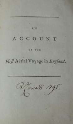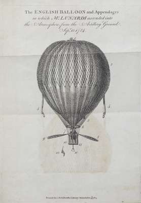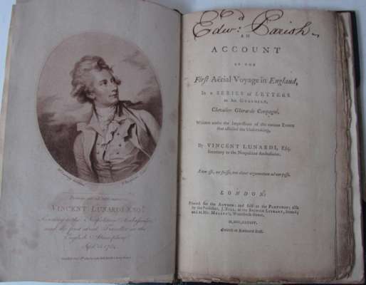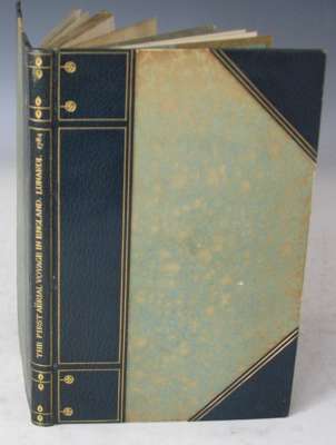 An account of the first aerial voyage in England. London: for the author, 1784. First edition, 8vo, engraved frontispiece portrait, 2 engraved folding plates, signed by the author on the half-title, with added engraved portraits of Lunardi and John Wilkins, Bishop of Chester, tipped in, a ticket to Lunardi's ascension mounted and bound in after the last leaf, an article by A.M. Broadley on "The Soaring Curiosity of Samuel Johnson", from The Outlook for March 5, 1910, and uncorrected proofs of the same article bound in, blue half morocco gilt