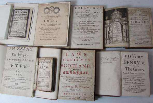 The laws and customes of Scotland in matters criminal. Edinburgh: Printed by Thomas Brown, 1678. Second edition, 4to., title printed in red and black, early nineteenth century calf, red morocco label, slight damage to lower corner of first two leaves affecting one letter, title slightly dusty, [Wing M167], lacks the license leaf before title; [Péréfixe de Beaumont, Hardouin de] The history of Henry IV, surnamed the great. King of France and Navarre. London: J. Martyn & H. Herringman, 1672. 8vo., inscription of Philip Constable June 1672, eighteenth century calf, [Wing P1465eA]; Walker, William Idiomatologia Anglo-Latina. London: Joseph Clark, 1673. 8vo., engraved frontispiece, later half calf, slight marginal dampstaining, title dusty, [Wing W425], [Carier, Benjamin] A carrier to a king, or doctour Carrier (Chaplayne to K. James of happy memory) his motives for renouncing the Protestant religion. [St. Omer: English College Press], 1635. 12mo., contemporary calf, [STC 4625.5], slight dust-soiling and slight dampstaining, rubbed; [Walker, Clement] Relations and observations, historicall and politick, upon the parliament, begun Anno Dom. 1640. [?London]: printed in the yeare 1648. 4to., modern calf-backed boards, [Wing W334A]; [Scott, Thomas] A paire of Cristall spectacles with which any man may see plainly at a miles distance into the Councells of the army. Printed in the Yeare 1648. One leaf, 4to., quarter vellum, [Wing (2nd ed.) S2088]; [Cunningham, James] An essay upon the inscription of MacDuff's crosse in Fyfe, by I.C. Edinburgh: Heir of Andrew Anderson, 1678. 4to., wrappers, tear to title repaired, [Wing C7593]; [Anon.] A sermon preach'd on the barba[r]ous and bloodie murder of the royal martyr King Charles the First. [No place], Printed in the year, 1708. 12mo. in 4s, modern wrappers, [not traced in ECCO] (8)