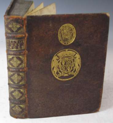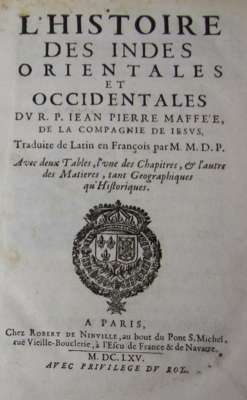 L'histoire des indes orientales et occidentales. Paris: Robert de Ninville, 1655. 2 parts in one volume, 4to, woodcut initials and ornaments, contemporary calf, gilt arms on sides of William Douglas, third Earl and first Duke of Queensberry, and gilt stamp of The Society of Writers to the Signet, paper fault tear to outer blank margin of Nn1 in part 2, spotting, worn, joints cracked
