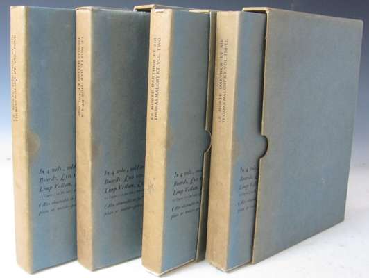 Le Morte dArthur. The book of King Arthur and of his Noble Knights of the round table. London: P.L. Warner, publisher to the Medici Society, 1910-11. 4 volumes, 4to, number 316 of 500 copies on handmade Riccardi paper, 48 coloured plates by Sir W. Russell Flint, original limp vellum gilt, uncut, top edges gilt, green silk ties, original dust wrappers, slipcases, a very good set