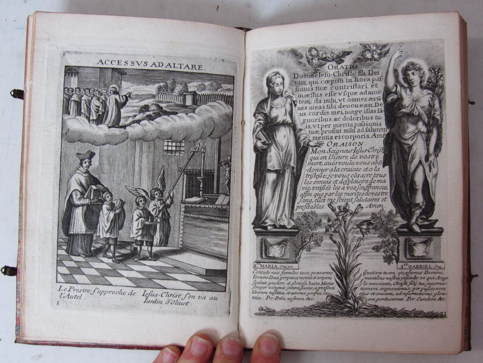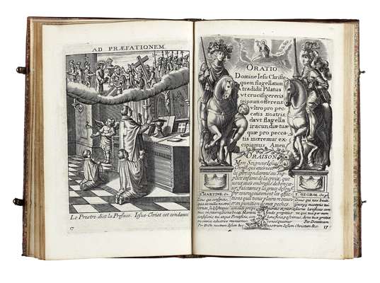 Le tableau de la croix representé dans les ceremonies de la Sainte Messe. Paris: F. Mazot, 1651 [ but 1653]. 8vo., engraved frontispiece and portrait, engraved throughout, ?18th century red morocco panelled in gilt with decorative fleurons, gilt clasps and edges, marbled endpapers, modern John Evelyn bookplate