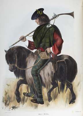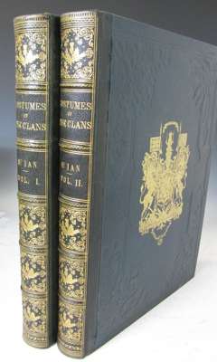 The clans of the Scottish Highlands. London: Ackermann and Co., 1845. Folio, 2 volumes, hand coloured portrait and frontispiece in each volume showing coats of arms and 72 hand coloured lithographed plates, original blue morocco-backed cloth, with blind floral tooling on covers, gilt royal coat of arms on front covers and gilt tooled thistle decoration on spine, occasional internal foxing, 'Drummond' plate in volume 1 loose (2)