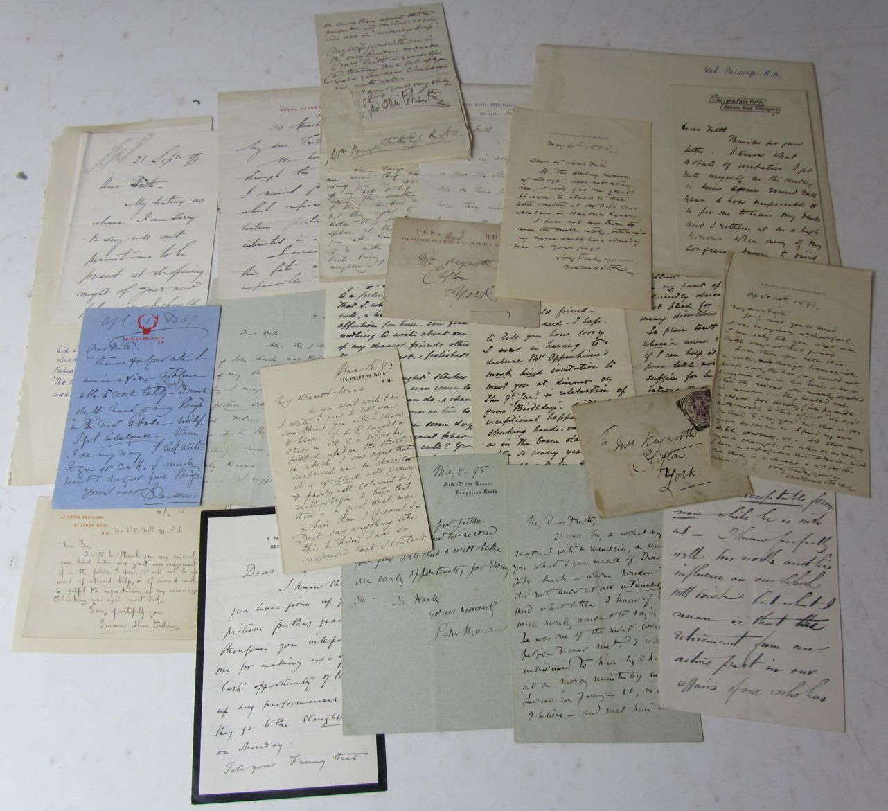 A collection of letters to William Powell Frith from various artists, mostly 8vo., circa 40 pages dating from 1st April 1869 - 30th March 1905, many referring to John Leech including: Autograph letter signed "Yours ever "Landseer"", dated 1st April 1869 thanking Frith for his note and attributing his recent lack of work output to his "Eyes!"; Two autograph letters signed "Very sincerely yours John Tenniel", dated 9th January 1905, (one letter incomplete with paper discolouration), congratulating Frith on his 87th birthday, he also declines a dinner invitation on account of his age; Two autograph letters signed G. du Maurier", the first discussing Leech's death; Two autograph letters from Millais, signed "J.E. Millais"; and 11 other autograph letters an envelope from various artists including George Cruickshank, Lawrence Adam Tadema and Frith (17)
